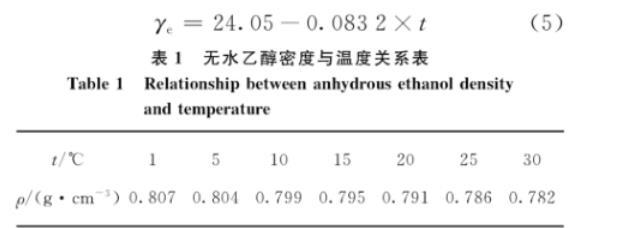 毛細(xì)管的實(shí)際內(nèi)半徑r與生產(chǎn)標(biāo)號(hào)NRI有一定差異,需進(jìn)行標(biāo)定。文中毛細(xì)管內(nèi)半徑在0.08——0.50mm范圍內(nèi),難以直接測(cè)定。利用式(2),選擇無水乙醇作為標(biāo)定液,內(nèi)半徑較粗、可測(cè)的毛細(xì)管作為基準(zhǔn)管,反向標(biāo)定較細(xì)毛細(xì)管的內(nèi)半徑。標(biāo)定過程為:(1)通過電荷耦合器件(CCD)相機(jī)拍攝,并獲取基準(zhǔn)管的內(nèi)半徑。(2)使用相機(jī)拍攝毛細(xì)管內(nèi)液面上升高度,以及無水乙醇與管內(nèi)壁的接觸角;(3)記錄試驗(yàn)溫度t.根據(jù)無水乙醇的表面張力計(jì)算公式和溫度~密度特性表獲得其表面張力γe與密度ρ,見式(5)和表1.(4)將上述參數(shù)代入式(2),得到毛細(xì)管的內(nèi)半徑值。