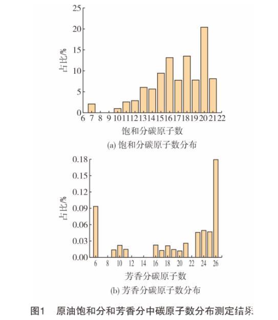 疏水端擴散進入原油的能力對表面活性劑在油水界面吸附,降低油水界面張力有直接影響。根據“相似相溶”原理,表面活性劑疏水端擴散進入原油的能力和其是否與原油中低極性組分(即飽和分和芳香分)具有相似結構密切相關。因此,測定原油中飽和分和芳香分的碳原子數分布,對快速篩選驅油用表面活性劑具有指導意義。