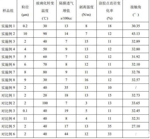 測試結(jié)果表明,當(dāng)膠液稀釋液表面張力在28mN/m以上時,隔膜粘接劑組合物涂布并干燥后的膠點直徑變化率較小,當(dāng)表面張力太低時,膠點直徑變化率較大,透氣增值變大。當(dāng)聚合物顆粒A粒徑在0.2-10μm,玻璃化轉(zhuǎn)變溫度在30-90℃范圍內(nèi)時,隔膜同時具有較低的透氣增值以及更好的剝離強度。聚合物顆粒A粒徑太小時,容易堵塞隔膜孔道造成透氣增值增大,并且剝離強度也較弱。聚合物顆粒A粒徑太大,聚合物顆粒A涂布后容易脫落,剝離強度降低。聚合物顆粒A玻璃化溫度太高,熱壓時無法軟化,剝離強度低;而玻璃化溫度太低則容易成膜,造成隔膜透氣增值變大。