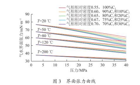 如圖3所示為利用新模型繪制的不同溫度和壓力下的界面張力曲線。從圖中可知,壓力越大,溫度越高,氣水界面張力越?。粴怏w相對密度越大,氣水界面張力越小。當壓力和溫度分別為0~40 MPa和20~200℃時,界面張力范圍為30~75 mN/m,不能看成常數。