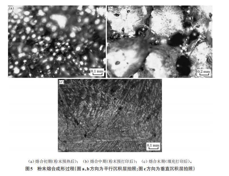 圖5粉末熔合成形過程(圖a、b方向?yàn)槠叫谐练e層拍照;圖c方向?yàn)榇怪背练e層拍照)