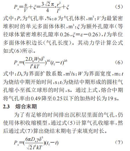 為了有足夠的時(shí)間排出沉積層里面的氣孔,仍使用體積收縮模型,通過式(5)計(jì)算氣孔收縮率,然后通過式(7)算出燒結(jié)末期電子束填充時(shí)長。