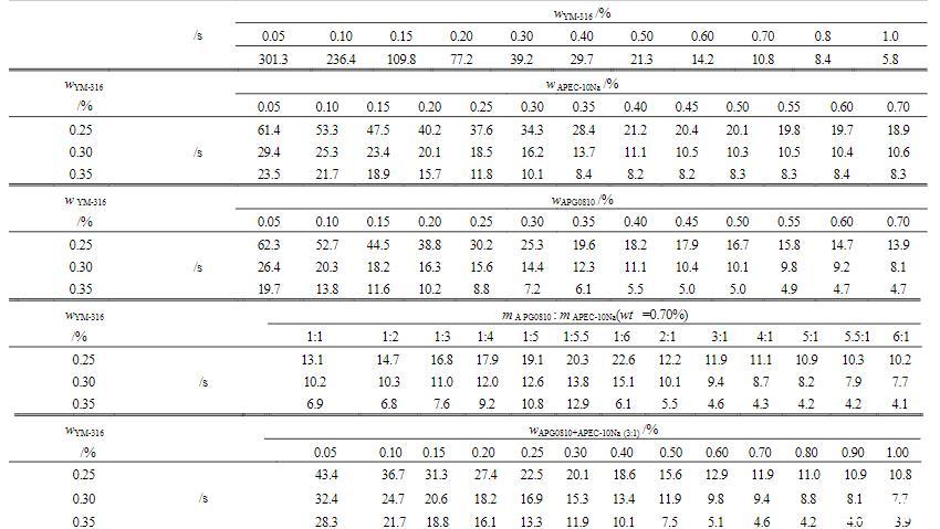 由表3可見,單一的YM-316溶液即可滿鋪在環(huán)己烷表面,表現(xiàn)出較強的鋪展性能。其中,最低鋪展質(zhì)量分數(shù)為0.05%,此時鋪展時間為301.3s。隨著YM-316質(zhì)量分數(shù)不斷增大,鋪展時間不斷減小,當YM-316質(zhì)量分數(shù)達到1.0%時,鋪展時間降低至5.8s。另外,在YM-316分別與APG0810和APEC-10Na的二元復配體系中,當YM-316的質(zhì)量分數(shù)為0.25%、0.30%和0.35%時,在質(zhì)量分數(shù)為0.055%~1.0%的范圍內(nèi),隨著APG0810或APEC-10Na濃度的增加,其體系的鋪展時間逐漸縮短,這種趨勢在低濃度區(qū)域較高濃度區(qū)域要大;而在APG0810或APEC-10Na相同濃度下,隨YM-316質(zhì)量分數(shù)增加其體系的鋪展時間也逐漸縮短。這些均表明YM-316與APG0810或APEC-10Na對環(huán)己烷表面的鋪展作用有良好相互促進效果,YM-316與APG0810和APEC-10Na組成的三元復配體系也是如此,且三元體系的鋪展性能比二元體系更好。氟表面活性劑的成本常常占到水成膜泡沫滅火劑成本的80%,APG0810和APEC-10Na作為一種良好的鋪展助劑,添加到含YM-316的滅火劑中,可在保持溶液原有鋪展性能的情況下,大幅降低YM-316的用量,從而大大降低水成膜泡沫滅火劑的成本。