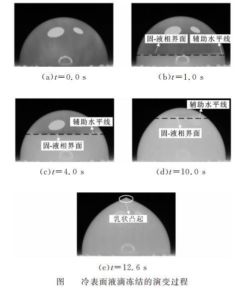 根據晶體生長理論可知,晶體的生長過程實際上就是晶體-流體界面向流體中的推進過程,可以看作是固-液相界面向液相區中推進的過程,固-液相界面并不是平坦的界面,而是具有一定弧度的凹界面。冷表面液滴的凍結過程如圖1所示。隨著固-液相界面的推進,液相區的質量不斷減小,相變過程中密度變化引起體積增大的效果在未凍結的液相區不斷累積,導致液滴發生變形,最終在液滴頂部形成一個明顯的乳狀凸起;液滴凍結過程中,早期液滴形狀的變化僅體現在高度方向上,而整體仍保持為半球形,如圖2所示。