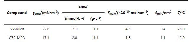 我們進一步探究了C72-MPB與化合物6:2-MPB表面性能的差異,使用Gibbs方程對rcmc的值進行計算,由rcmc進一步計算在cmc處每個分子在空氣~水界面的表面活性劑所占面積,即Amin: