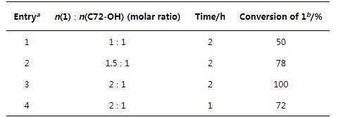我們將原料1和C72-OH等物質的量比混合,以超干四氫呋喃(THF)為溶劑,在0℃下進行反應,2 h后通過核磁氫譜(1H NMR)觀測到有產物生成。但原料C72-OH的轉化率僅為50%(表1,Entry 1)。因此,我們對反應物的比例、反應時間做進一步優化。結果顯示:在原料1與原料C72-OH物質的量比為2∶1,反應時間為2 h的條件下,原料C72-OH可完全轉化(表1,Entry 3)。接下來,我們將中間體C72-P與3 equiv.三甲胺(2 mol/L in THF)溶解在乙腈中,在70℃下反應48 h,高產率得到目標產物C72-MPB.用類似方法合成了結構相似的氟碳表面活性劑6:2-MPB(表2),并對比了C72-MPB與6:2-MPB的表面活性性能。