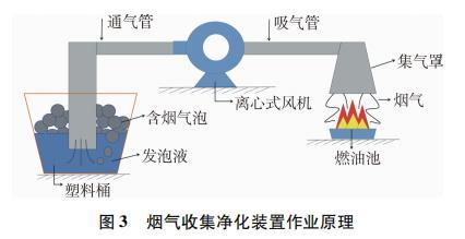 煙氣收集凈化裝置主要由置液桶、通氣管、離心式風(fēng)機(jī)、吸氣管、集氣罩和燃油池等組成,其凈煙工作原理如圖3所示。風(fēng)機(jī)抽走集氣罩下燃油池中汽油燃燒的黑煙,將其通入桶內(nèi)發(fā)泡液中;氣體進(jìn)入液體后會(huì)立刻浮出液面,在液體表面張力作用下排出液面的煙氣被液膜包裹成含煙氣泡;隨著煙氣不斷被通入發(fā)泡液中,含煙泡泡很快就溢滿整個(gè)置液桶。實(shí)驗(yàn)前測(cè)量并記錄水及發(fā)泡液的pH值。