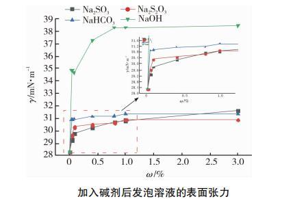圖4是不同質(zhì)量分?jǐn)?shù)堿劑發(fā)泡液表面張力的測(cè)試結(jié)果。強(qiáng)堿NaOH使發(fā)泡液表面張力明顯提高,在NaOH質(zhì)量分?jǐn)?shù)3%時(shí)達(dá)到最大值38.3mN/m,隨后發(fā)泡液表面張力值保持穩(wěn)定,不受NaOH含量變化影響。說(shuō)明NaOH濃度升高時(shí)OH-過(guò)多,造成圖4加入堿劑后發(fā)泡溶液的表面張力表面活性物質(zhì)停留于溶液表面,阻礙了OH-與更多表面活性物質(zhì)的反應(yīng)機(jī)會(huì),溶液表面張力不再受影響。圖4中弱堿Na2S2O3,NaHCO3變化規(guī)律與NaOH相似,低濃度時(shí)發(fā)泡液表面張力激增,達(dá)到質(zhì)量分?jǐn)?shù)0.8%之后,表面張力值增幅減緩。NaOH加入使發(fā)泡液表面張力增加了35.7%,而其他3種弱堿無(wú)機(jī)鹽在濃度最大時(shí)(質(zhì)量分?jǐn)?shù)3%)僅增加約10%.與強(qiáng)堿劑相比,弱堿劑對(duì)溶液表面張力影響較小。