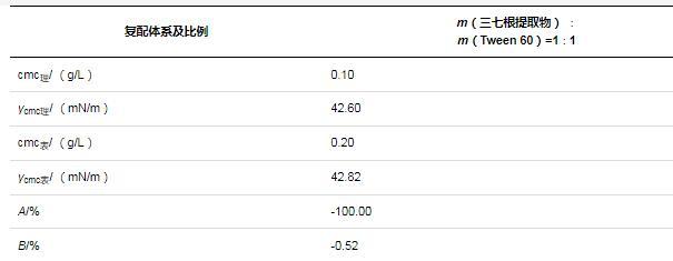 由前文實驗結果可知,三七根提取物與Tween 60的cmc均為0.1 g/L。根據(jù)2.3.2中方法,確定了三七根提取物與Tween 60復配質量比為1∶1。在25℃下,復配體系理論值和表觀值如表3所示。三七根提取物與Tween 60的復配體系形成膠束的能力減效100%,降低溶液表面張力的能力減效0.51%。結果表明,三七根提取物與Tween 60按1∶1質量比復配后,并不能對體系產生明顯的協(xié)同增效作用,這可能與三七根提取物和Tween 60的含量、結構有關。