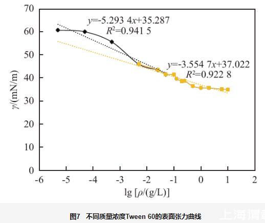 測量不同質量濃度的Tween 60水溶液的表面張力,并繪制表面張力(γ)對質量濃度(ρ)的對數(shù)曲線如圖7所示。將轉折點兩側的擬合直線外延,相交點為cmc,其質量濃度約為0.1 g/L,對應的表面張力γcmc為41.52 mN/m。