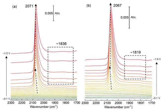 圖1. 在CO2飽和的0.1 M KHCO3/H2O電解質中,(a)制備前銅薄膜和(b)陽極氧化銅薄膜在1700-2300 cm-1區域的原位SEIRAS光譜。0 V處的光譜用作背景。