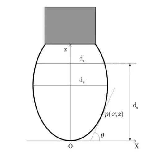 對于圖1所示的液體懸滴,以懸滴頂點(diǎn)O為坐標(biāo)原點(diǎn),該點(diǎn)處的水平切線為x軸,懸滴輪廓的對稱軸為z軸,建立平面直角坐標(biāo)系。設(shè)懸滴輪廓上任意一點(diǎn)p的坐標(biāo)為(x,z),p點(diǎn)處切線與x軸的夾角為θ。