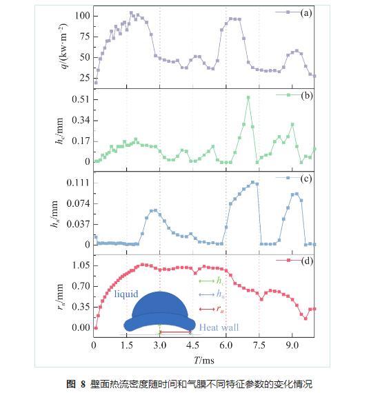 從圖7可以看出,相對(duì)于壓強(qiáng)的變化情況,壁面的熱流密度與氣膜的相關(guān)性更強(qiáng),氣膜厚度的變化會(huì)引起熱流密度的變化。圖8是液滴撞擊過(guò)程中壁面平均熱流密度及氣膜不同特征參數(shù)隨時(shí)間的變化情況,圖8(a)是壁面平均熱流密度,可以看出,平均熱流密度的變化情況受液滴中心氣膜厚度影響較大,在前期鋪展階段中心氣膜厚度出現(xiàn)明顯波動(dòng)時(shí)熱流密度也相應(yīng)波動(dòng),在液滴收縮階段,熱流密度變化明顯與頸部氣膜厚度成正相關(guān);圖8(b)是液滴中心氣膜高度,中心氣膜高度波動(dòng)最為劇烈,在液滴撞擊前3 ms內(nèi),即液滴鋪展階段先伴隨不穩(wěn)定波動(dòng)升高再保持穩(wěn)定,當(dāng)液滴開始收縮時(shí)出現(xiàn)大范圍的波動(dòng);圖8(c)是液滴頸部氣膜厚度,頸部與中心點(diǎn)通常為液滴底部氣膜厚度最薄點(diǎn),也是熱流密度峰值點(diǎn);圖8(d)是液滴的頸部半徑長(zhǎng)度,它的變化規(guī)律與液滴鋪展情況相似,且可以用來(lái)表示液滴與壁面的有效換熱面積。相較其他兩項(xiàng)特征參數(shù)而言,液滴中心氣膜厚度顯然對(duì)熱力學(xué)能具有更高的影響。