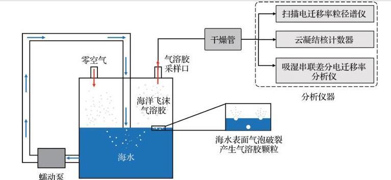 SSA生成裝置能夠在實驗室環(huán)境中模擬自然海洋系統(tǒng),實現(xiàn)在受控條件下從天然海水中產生SSA,并結合儀器表征顆粒的粒徑分布和理化特性。目前常用的模擬裝置有鼓泡式發(fā)生器、射流式發(fā)生器及波浪破碎式發(fā)生器等。本文以射流式SSA發(fā)生器為例,介紹SSA的生成原理(圖2)。通常來說,發(fā)生器都具有進水口、進氣口和采樣口。利用蠕動泵將海水從發(fā)生器底部周期性循環(huán)到頂部噴嘴,形成一個俯沖射流水柱,撞擊水面并將空氣夾帶進入海水中,在水下一定深度產生氣泡羽流。當氣泡上升到水氣界面并破裂時,產生SSA顆粒。采用潔凈零空氣作為載氣,將生成的SSA顆粒通過氣溶膠采樣口進行采集,連接干燥管進行干燥。此后,使用掃描電遷移率粒徑譜儀測量SSA的粒徑分布和數(shù)濃度等。該裝置可連接其他儀器,如CCN計數(shù)器和吸濕串聯(lián)差分電遷移率分析儀等進行CCN活性及吸濕性等的表征。
