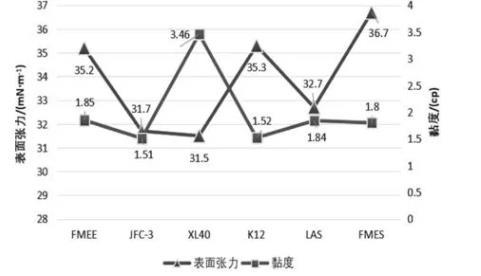 對比圖2中不同種類活性劑溶液的表面張力和黏度可以得出,FMES的表面張力數值最高(36.7mN·m-1),XL40的黏度數值最高(3.46cp),可見這兩種活性劑都不是最優的表面活性劑?;钚詣〧MEE與K12的表面張力數值相近,僅差了0.1mN·m-1,但其溶液的表面張力較高,無法滿足條件要求?;钚詣L40的表面張力最低,僅為31.5mN·m-1,但由于其黏度最高為3.46cp,綜合來說效果不佳。綜合表面張力與黏度雙重作用效果,活性劑JFC-3與其他活性劑相比占有明顯優勢,故選擇非離子表面活性劑JFC-3進行后續研究。