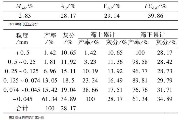 由表1、2可知,該煤樣水分為2.83%,灰分為28.17%,揮發(fā)分為29.14%,固定碳含量為39.86%。-0.045 mm粒級以下的煤泥產率為61.34%,灰分為34.89%,說明該煤樣中細粒煤占比大且灰分較高,煤樣為高灰細粒難浮煤泥。