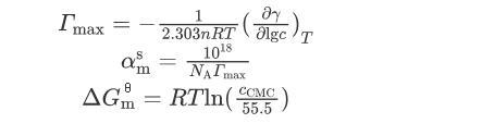 式中:γ為表面張力,mN/m;c為表面活性劑的濃度,mol/L;T為溫度,298 K;R為摩爾氣體常數,8.314 J/(mol·K);n為與表面活性劑性質相關的參數,對于本文研究的非離子表面活性劑,n=1;N A為阿伏加德羅常數;c CMC為臨界膠束濃度,mol/L。