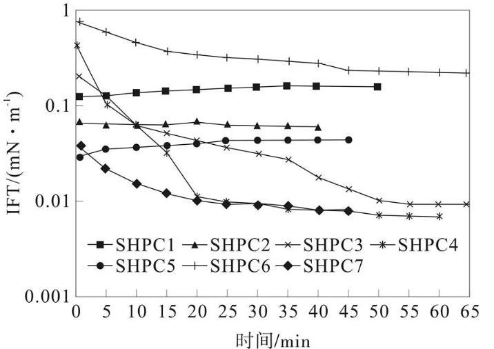 將SHPC1~7活性體系溶液配制為濃度大小為0.25%的溶液,密閉24 h,然后利用Texas-500C界面張力儀對界面張力進(jìn)行動(dòng)態(tài)測定,從而得到圖2所示的結(jié)果。