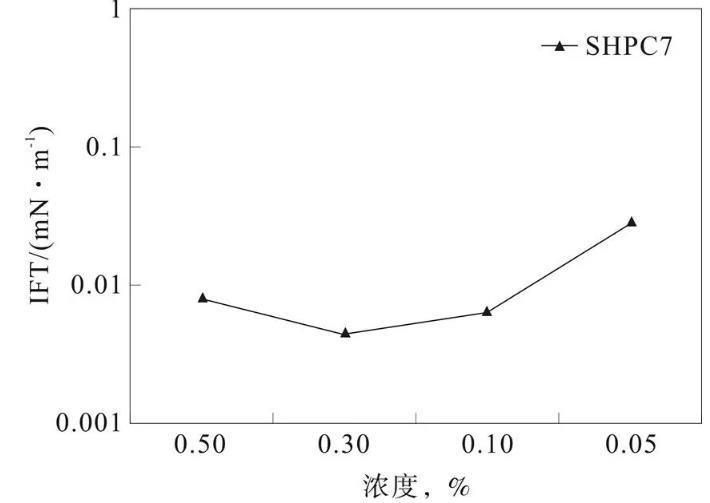 為進(jìn)一步驗(yàn)證SHPC7濃度大小對界面張力的影響,從而為后續(xù)的驅(qū)油效果奠定基礎(chǔ),設(shè)置0.05%、0.10%、0.30%和0.50%四種不同的濃度。同樣采用Texas-500C界面張力儀對不同濃度下的界面張力進(jìn)行測定。通過實(shí)驗(yàn)可以得到圖3的界面張力變化情況。