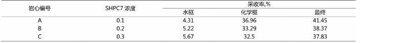由此,通過表2看出,在增大SHPC7表明活性劑的濃度下,其驅(qū)油效果在不斷增加。但是在0.3%的濃度下其驅(qū)油采收率小于濃度為0.2%的采收率。根據(jù)上述的結(jié)果得出,在實(shí)際的應(yīng)用中,應(yīng)選擇SHPC7表明活性劑濃度大小為0.2%的濃度,此時(shí)采收率最高。