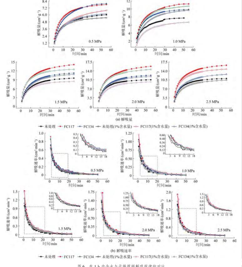 由圖6b可知,隨著甲烷吸附平衡壓力的增加,3種處理方式的含水煤樣解吸速率均有所增加。經(jīng)過氣潤(rùn)濕反轉(zhuǎn)劑FC117和FC134處理后的煤樣解吸速率也始終大于未處理的煤樣。其中,表面活性劑FC117處理后的煤樣解吸速率始終保持著顯著的效果。同時(shí),由于水鎖效應(yīng)產(chǎn)生的影響,不同處理方式的含水煤樣解吸速率均小于干燥煤樣的解吸速率。