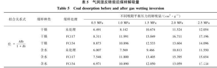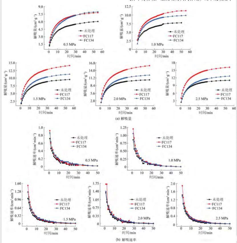 4)對(duì)經(jīng)過FC117和FC134處理后的干燥/含水煤樣進(jìn)行解吸量和解吸速率的測(cè)定,兩種表面活性劑處理后煤樣的解吸效果均有顯著的效果。在氣潤(rùn)濕反轉(zhuǎn)劑處理后的煤樣吸附量小于未處理的,而解吸量和解吸速率大于未處理的,則表明氣潤(rùn)濕反轉(zhuǎn)劑處理后的煤樣可以消除水鎖效應(yīng),增加解吸率,提高解吸效果。