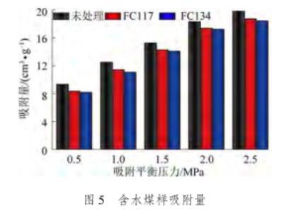 由圖5可知,隨著甲烷吸附平衡壓力的增加,氣潤(rùn)濕反轉(zhuǎn)劑處理前后煤樣的吸附量均逐漸增加,且增加量均呈現(xiàn)逐漸減小趨勢(shì)。經(jīng)過氣潤(rùn)濕反轉(zhuǎn)劑FC117和FC134處理后的煤樣吸附量始終小于未處理的煤樣,其變化規(guī)律與干燥煤樣的吸附量一致。其中,含水煤樣的吸附量略小于干燥煤樣的吸附量,其主要原因是在含水率為1%的煤樣中,少量的水滯留在煤體內(nèi)部。一方面,由于水的體積侵占了原本甲烷分子存在的空間;另一方面,由于煤樣自身的親水性,水在煤體表面的吸附能力強(qiáng)于甲烷氣體,使得部分吸附狀態(tài)的甲烷分子被置換和驅(qū)替。因此,含水煤樣的甲烷吸附量略小于干燥煤樣的吸附量。