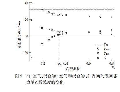 乙醇的初始濃度是本實(shí)驗(yàn)中的一個(gè)關(guān)鍵參數(shù)。在實(shí)驗(yàn)中我們觀察到當(dāng)乙醇初始濃度φ0大于一臨界濃度φc時(shí),液滴出現(xiàn)不穩(wěn)定性。為了解釋不穩(wěn)定性的發(fā)生,本文測(cè)量了相應(yīng)油~空氣、混合空氣和混合油界面的界面張力γoa、γma和γmo.圖5顯示了油~空氣、混合物~空氣和混合物~油界面的表面張力隨乙醇濃度的變化。油~空氣的界面張力γoa不變,混合物~空氣界面張力γma和混合物~油的界面張力γmo隨液滴中乙醇含量增大而減小。定義擴(kuò)散參數(shù)S=γoa-γma-γmo.當(dāng)擴(kuò)散參數(shù)為正值時(shí),液滴會(huì)擴(kuò)散到油(疏水性液體)上,發(fā)現(xiàn)該標(biāo)準(zhǔn)與液滴不穩(wěn)定性的開(kāi)始一致。隨著乙醇初始含量φ0增大,S會(huì)逐漸增大,存在一個(gè)臨界乙醇含量φc,且φc處S=0,因此可認(rèn)為:只有乙醇的初始含量大于φc時(shí),才會(huì)發(fā)生“液滴爆炸”現(xiàn)象。