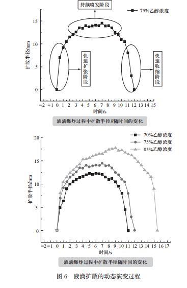 實(shí)驗(yàn)1探究液滴擴(kuò)散的動(dòng)態(tài)演變過(guò)程就是將前文用文字性描述的液滴擴(kuò)散現(xiàn)象定量處理,用數(shù)據(jù)清晰的看出液滴爆炸過(guò)程中擴(kuò)散半徑隨時(shí)間的變化,如圖6所示,可以從折線圖中直觀看出液滴爆炸的三個(gè)過(guò)程。