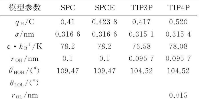 水分子模型很多,如SPC、SPCE、TPI3P和TPI4P等,其結構示意圖和模型參數分別見圖3和表1。水分子的勢能函數如式(1)所示。