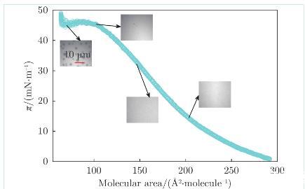 圖2為膜表面壓強(qiáng)隨膜密度的變化曲線,(以DPPC磷脂分子所占平均面積作為衡量膜密度的物理量)。在顯微鏡下觀察了膜在不同密度下的形貌(圖2中4張照片)。膜被壓縮到100?2/molecule之前,處于液態(tài)擴(kuò)張(Liquid Expanded,LE)相,磷脂分子排列較松散,膜表面結(jié)構(gòu)均勻。當(dāng)膜被壓縮到60~100?2/molecule時(shí),膜上開(kāi)始出現(xiàn)直徑為幾微米的磷脂凝聚(Tilted Condensed,TC)相(照片中斑點(diǎn)),TC區(qū)域內(nèi)磷脂分子的排列比LE區(qū)域更緊密。熒光劑Texas red DHPE傾向于分布在LE區(qū)域,因此LE區(qū)域顯示為淺色,TC區(qū)域顯示為深色。膜繼續(xù)被壓縮,在LE?TC共存相階段,膜表面壓強(qiáng)恒定在45 mM/m左右,TC區(qū)域數(shù)量和面積占比增大。當(dāng)膜被進(jìn)一步壓縮(<60?2/molecule),此時(shí)膜表面幾乎被TC區(qū)域占據(jù),TC區(qū)域相互擠壓,導(dǎo)致膜表面壓強(qiáng)直線上升,LE區(qū)域僅存在于TC區(qū)域之間的空隙。