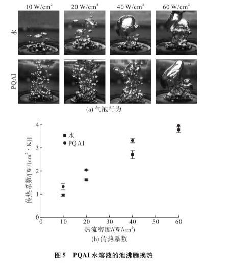 本文研究了PQAI溶液的池核沸騰換熱特性,試驗臺參數參考文獻。圖5顯示了PQAI溶液在臨界膠束濃度下的沸騰傳熱性能。與水相比,由于PQAI水溶液中表面張力的降低,沸騰時產生的氣泡數量顯著增加,氣泡半徑減小。此外,在低熱流密度下,可以明顯觀察到在氣泡脫離時氣泡聚結的趨勢減小,并且氣泡的形狀更接近球形。表面活性劑分子由極性親水頭和疏水性長尾組成。