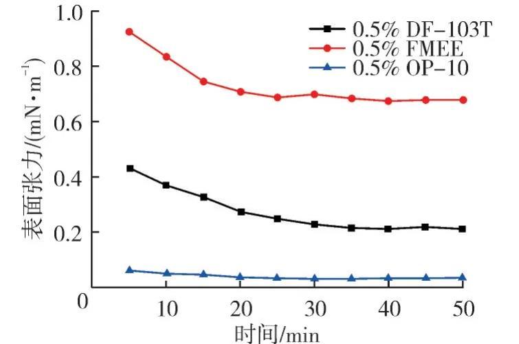 測定0.5%的DF-103T、OP-10、FMEE這3種非離子表面活性劑的表面張力,結果見圖2。