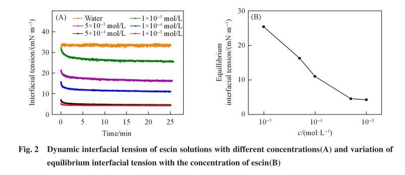 使用視頻光學接觸角測量儀,利用懸滴法測定溶劑油150#和不同濃度七葉皂素溶液的油-水界面張力.溶液為內相,溶劑油150#為外相.將七葉皂素溶液置于氣密性良好的注射器(針管外徑為1.65 mm)中,利用步進馬達將溶液(8μL)注射到裝有溶劑油150#的玻璃皿中,CCD攝像機同步記錄測定過程的液滴狀態(每次測定25 min),軟件通過液滴形狀分析計算出界面張力.分別測定超純水以及不同濃度七葉皂素溶液與溶劑油150#的界面張力,每個樣品重復測3次.