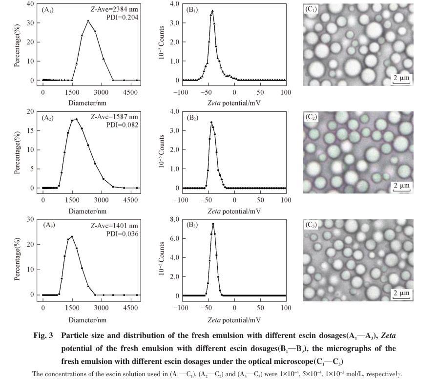 首先使用激光粒度儀表征了新制乳液的粒徑大小及分布情況,如圖3(A1)~(A3)所示.隨著七葉皂素濃度從1×10-4mol/L增大到1×10-3mol/L,乳液平均粒徑Z-Ave從約2.4μm下降至1.4μm,單分散系數(PDI)逐漸降低,粒徑分布范圍逐漸變窄,表明乳液穩定性得以提高.光學顯微鏡表征結果[圖3(C1)~(C3)]也印證了該結論.