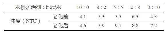 將水侵防治劑與地層水按不同比例(體積比)混合,測定其濁度值,并將其在80℃下放置4 h后,繼續(xù)測定其濁度值變化情況,以此考察水侵防治劑與地層水的配伍性,結果見表2。可以看出,水侵防治劑的自身濁度較低(僅為4.1NTU),并且其與地層水按不同比例混合后的濁度值均未明顯增大,在80℃下老化4 h后濁度值也仍小于10NTU,說明水侵防治劑與地層水具有良好的配伍性。