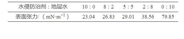 參照石油天然氣行業(yè)標準SY/T 5370—2018《表面及界面張力測定方法》中“圓環(huán)法”的要求,測定水侵防治劑與地層水按不同比例(體積比)混合后的表面張力值,結果見表1。可以看出,隨著水侵防治劑溶液比例的逐漸增大,溶液的表面張力值逐漸減小,當水侵防治劑與地層水按5∶5混合時,表面張力即可以降低至30 mN/m以下,說明水侵防治劑具有良好的降低表面張力的能力,從而有助于氣井解堵措施后的返排,提高施工效率。