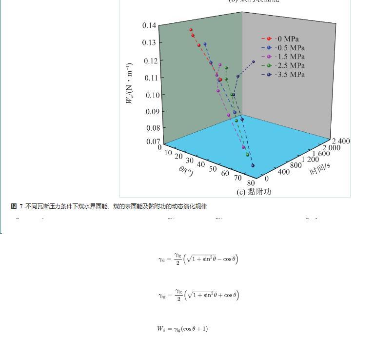 由圖7a可知,同一瓦斯壓力條件下,煤水界面能隨著潤(rùn)濕時(shí)間的增加而減小,隨著接觸角的減小而減小。因?yàn)槊核缑婺茉叫。衷饺菀自诿后w表面鋪展。同一時(shí)刻,瓦斯壓力越大,煤水接觸角越大,煤水界面能越大,水分越不容易在煤體表面鋪展;由圖7b可知,同一瓦斯壓力條件下,煤的表面能隨著潤(rùn)濕時(shí)間的增加而增加,隨著接觸角的減小而增大。因?yàn)槊旱谋砻婺茉礁撸饺菀妆凰疂?rùn)濕。同一時(shí)刻,瓦斯壓力越大,煤水接觸角越大,煤的表面能越小,水分越不容易在煤體表面鋪展;由圖7c可知,同一瓦斯壓力條件下,黏附功隨潤(rùn)濕時(shí)間的增加而增加,隨著接觸角的減小而增大。黏附功越大,越容易被水潤(rùn)濕。同一時(shí)刻,瓦斯壓力越大,煤水接觸角越大,黏附功越小,水分越不容易在煤體表面鋪展。因此,降低瓦斯壓力及延長(zhǎng)潤(rùn)濕時(shí)間有助于減小煤水界面能、增加煤的表面能及增加黏附功,進(jìn)而有助于提高水對(duì)煤的潤(rùn)濕效果。因此,采用煤層注水措施治理瓦斯及預(yù)濕減塵時(shí),應(yīng)給予煤體充分的潤(rùn)濕時(shí)間。