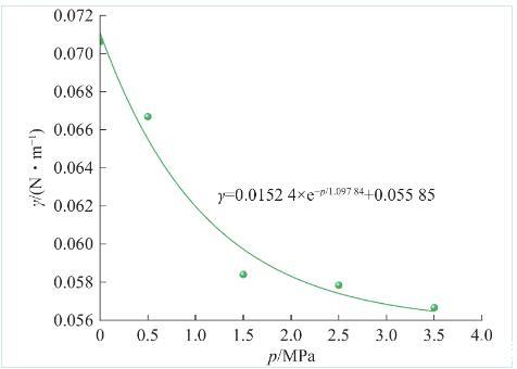 由圖4可知,水與瓦斯之間的表面張力隨著瓦斯壓力的增加而減小,表面張力與瓦斯壓力滿足負(fù)指數(shù)的關(guān)系,如式(3)所示。在水與瓦斯的界面,水分子兩側(cè)分別與瓦斯分子、液體分子接觸,表面分子受到的朝向液體內(nèi)部的吸引力大于氣體分子的吸引力。隨著瓦斯壓力的增加,水與瓦斯接觸表面之間的密度差逐漸減小,瓦斯分子對(duì)水分子的引力逐漸變大,抑制了液體表面分子向液體內(nèi)部的運(yùn)動(dòng),使系統(tǒng)的能量趨向于平衡狀態(tài)。因此,水與瓦斯之間的表面張力隨著瓦斯壓力的增加而減小。