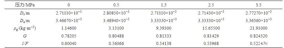 采用團(tuán)隊(duì)自開發(fā)的水與瓦斯之間的表面張力分析軟件對(duì)不同瓦斯壓力條件下的水滴形貌(圖3)進(jìn)行分析,即可獲得式(1)中的Ds及De。F為G修正后的形狀因子,F(xiàn)通過(guò)查表及插值法獲得,式(1)中的參數(shù)見表1,將表1中的參數(shù)帶入式(1)及式(2),即可獲得不同瓦斯壓力條件下水與瓦斯之間的表面張力(圖4)。