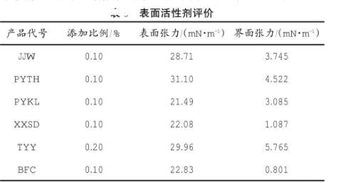 由表2可知,3種表面活性劑均具有較好的降低表面張力效果,在較低濃度時(shí)就達(dá)到了較低表面張力,且隨著濃度的增加表面張力趨于平穩(wěn);3種表面活性劑按降低表面張力性能由高到低排序依次為PYKL、XXSD和BFC。