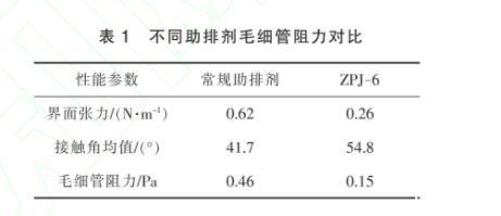 毛細(xì)管力的作用使流體流動(dòng)阻力增加,導(dǎo)致壓裂后壓裂液返排困難。如果地層壓力不能克服毛細(xì)管力,壓裂液濾液和殘?jiān)皆诹芽p表面,造成儲(chǔ)層孔隙堵塞和壓裂液無(wú)法返排,就會(huì)致使?jié)B透率降低,傷害儲(chǔ)層。為了減少壓裂液在地層的停留時(shí)間,須使用助排劑,降低壓裂流體的表面張力。以降低油水相間界面張力、增大與巖心表面接觸角兩方面為目標(biāo),選取不同助排劑進(jìn)行對(duì)比(見(jiàn)表1),優(yōu)選出具有較佳界面張力與接觸角平衡值的新型助排劑ZPJ-6。與常規(guī)產(chǎn)品相比,新型助排劑具有較低的界面張力和較高的接觸角,毛細(xì)管阻力相對(duì)減小。