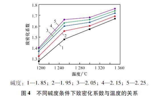 在燒結過程中,熔體表面張力是主要驅動力,而熔融混合物的表觀黏度是主要阻力。因此,這兩個因素是定量分析燒結過程中聚結行為的關鍵。根據公式(5),并參考文獻[17]中A和E的擬合值(A=1,E=1為簡化表征,實際計算中按該假設進行相對值比較),計算得到了不同堿度及溫度條件下燒結礦的致密化系數F_{Den},結果如圖4所示。