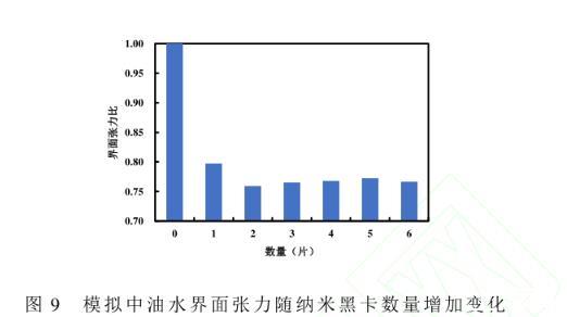 圖9模擬中油水界面張力隨納米黑卡數量增加變化