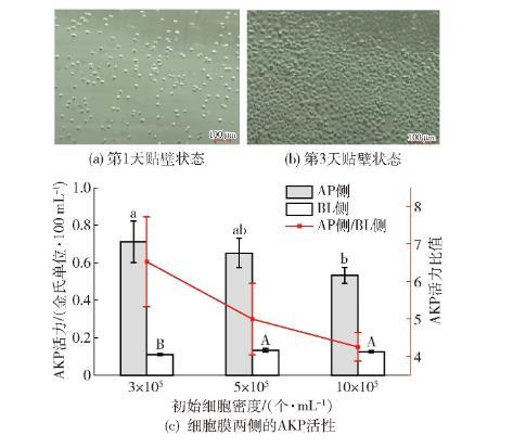 Caco-2細胞培養(yǎng)狀態(tài)及培養(yǎng)21 d后的堿性磷酸酶活性見圖10。由圖10(a)、(b)可以發(fā)現,培養(yǎng)3 d過程中,單層Caco-2細胞生長穩(wěn)定并均勻分布在Transwell上,貼壁情況良好。堿性磷酸酶AKP是小腸刷狀緣細胞的標志酶,其濃度代表了單層Caco-2細胞的極化和功能。觀察圖10(c)可知,培養(yǎng)21 d后,不同接種細胞密度在AP側的酶活性均高于BL側的酶活性,屬正常的細胞極化結果。初始密度為3×105個/mL的細胞AP側的AKP活性高于其他兩組,其BL側的AKP活性低于其他兩組,證明該組細胞分化情況較好。隨著細胞密度的增大,AP側與BP側活力的比值呈下降趨勢,說明初始細胞密度過大不利于細胞的分化。實驗結果表明,3種模型細胞均生長良好。