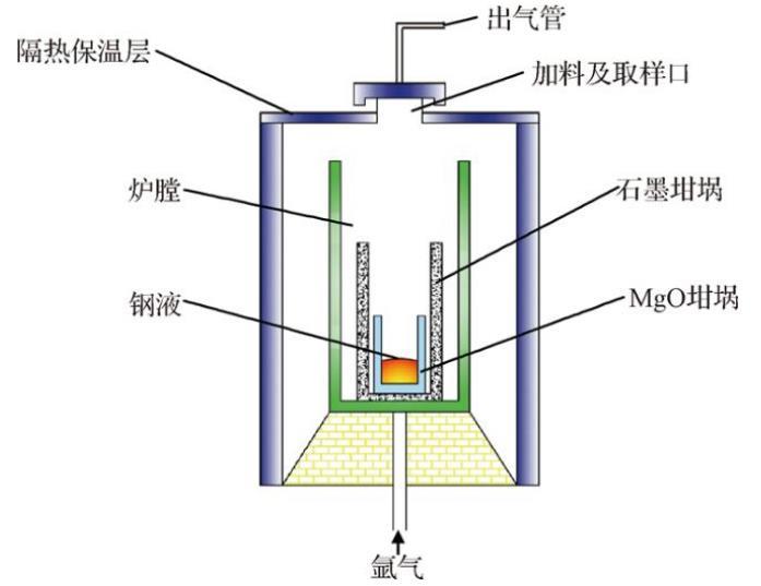 將重軌鋼鑄坯切成20 mm×15 mm×10 mm的鋼塊并打磨氧化皮,每爐試驗取約300 g鋼塊疊放在MgO質(zhì)量分?jǐn)?shù)為99.5%的坩堝中,并隨石墨坩堝一同放置在管式電阻爐中,調(diào)好程序緩慢加熱升溫,試驗裝置如圖1所示。當(dāng)溫度升至600℃時,氬氣(質(zhì)量分?jǐn)?shù)為99.99%)流量控制為2.5 L/min,保持坩堝內(nèi)中性氣氛,當(dāng)溫度升至900℃時,氬氣流量調(diào)整為3.5 L/min,爐膛升溫至1 600℃后持續(xù)保溫30 min以保證鋼液熔化且均勻。