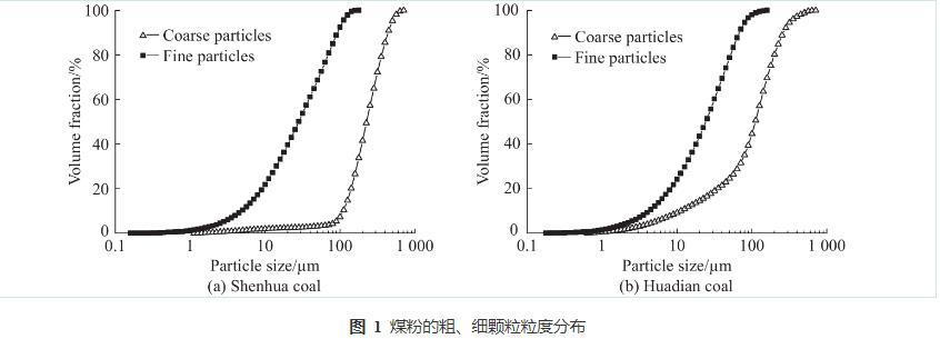 圖1煤粉的粗、細顆粒粒度分布