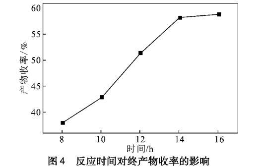 固定N,N-二(3-氯-2-羥基丙烷)丙二胺二乙酸鈉與十二胺投料比為1∶2.2,反應溫度為90℃,考察了反應時間對GAC-312收率的影響,結果見圖4。