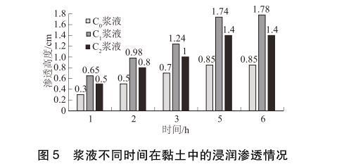 漿液浸潤(rùn)滲透速度隨時(shí)間變化的關(guān)系,其原因是漿液混合后,隨著時(shí)間的延長(zhǎng),分子量不斷增加,導(dǎo)致漿液的表面張力和接觸角不斷增大,從而引起漿液浸潤(rùn)滲透能力隨時(shí)間延長(zhǎng)而不斷下降。由于表面活性劑降低了漿液的表面張力和接觸角,所以能夠提高漿液在黏土中的浸潤(rùn)滲透能力,有利于漿液在黏土中的滲透擴(kuò)散。C1漿液在黏土中的浸潤(rùn)滲透高度要大于C2漿液在黏土中的浸潤(rùn)滲透高度,說(shuō)明表面活性劑S2分子結(jié)構(gòu)側(cè)鏈上多了乙氧基基團(tuán),雖然親水性增強(qiáng),但滲透性比側(cè)鏈上沒(méi)有乙氧基基團(tuán)的S1表面活性劑的改性效果差。