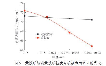 圖5黃鐵礦與磁黃鐵礦粒度對礦漿表面張力的影響
